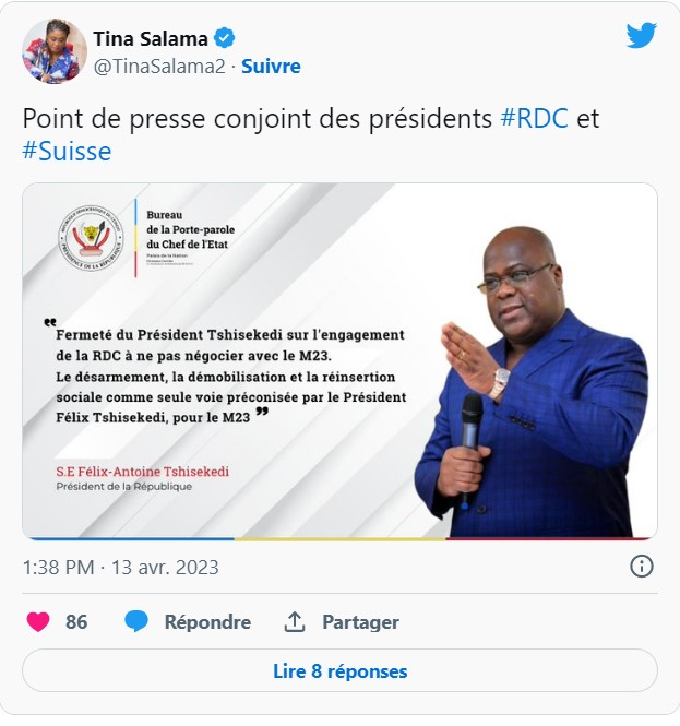 Félix Tshisekedi qui animait, jeudi à Kinshasa, une conférence de presse conjointe avec son homologue suisse, Alain Berset, a indiqué d’un ton ferme qu’ « il n’est pas question ici de dialogue politique avec ce groupe ».
